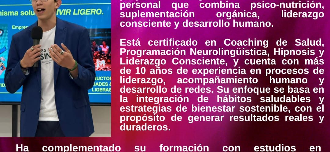 Con tan solo 25 años, su trabajo ha despertado el interés de profesionales, coaches, líderes, emprendedores y personas en búsqueda de un cambio auténtico. Su enfoque combina psico-nutrición, suplementación orgánica, hábitos conscientes, liderazgo, productividad y bienestar integral, convirtiéndolo en una de las voces emergentes más sólidas del desarrollo humano en Latinoamérica.
