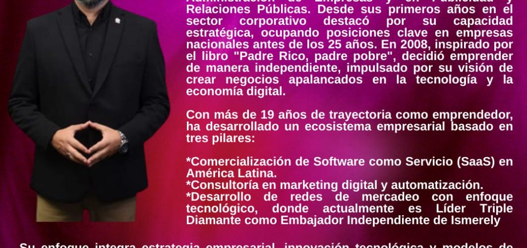 Su historia es la de un emprendedor visionario que ha construido resultados reales en distintos ámbitos: empresas de software, consultoría en marketing digital, automatización, liderazgo multinivel, educación emocional y transformación personal. Su enfoque combina experiencia empresarial, hiperproductividad, neuroeducación, bienestar integral y metodologías prácticas para ayudar a miles de personas a mejorar su vida, sus finanzas y su mentalidad.